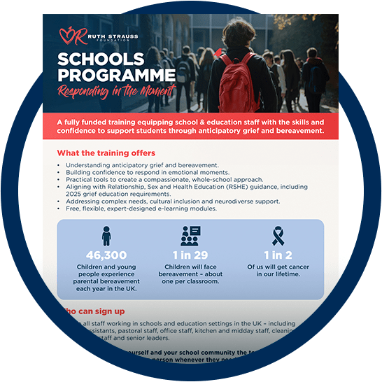 The Ruth Strauss Foundation supports families where a parent is facing an incurable cancer. Our new Schools Training Programme builds on that expertise and our experience working with families, but goes wider – ensuring it is suitable for any cause of grief (from any illness) and bereavement, including preparation for bereavement.